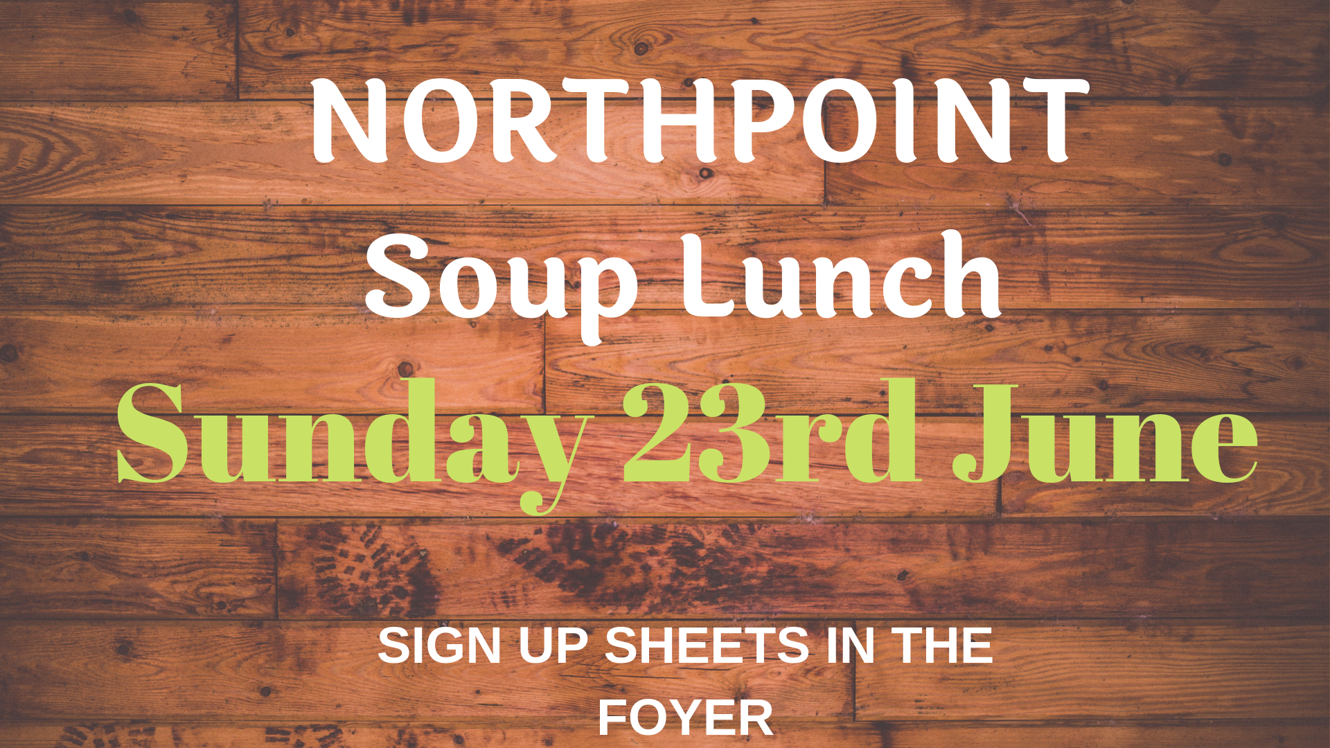 · Soup Lunch - We have a soup lunch coming up on Sunday the 23rd June. Please make sure to see the sign up sheets in the Foyer this is a great time of fellowship and yummy food.