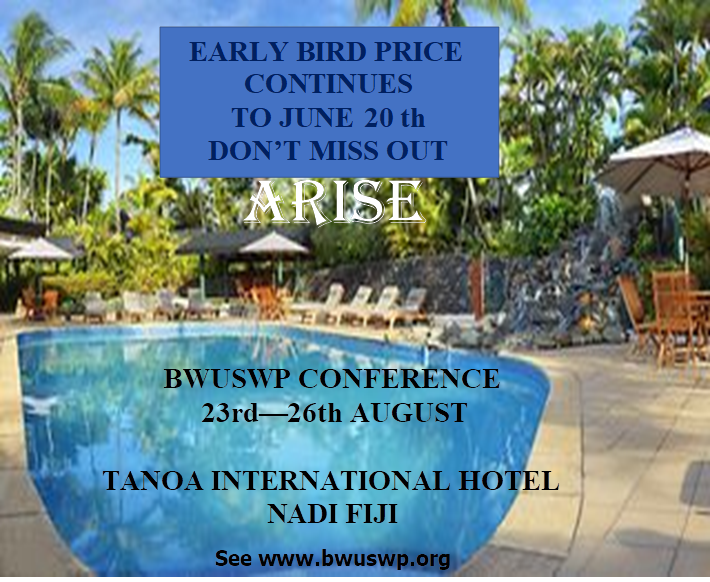 · BWUSWP Conference - 23rd to 26th August in Fiji. Early bird price has been extended to the 20th June. If you are interested in going to this conference in Fiji then visit www.bwuswp.org or see the notice board in the foyer for more information.